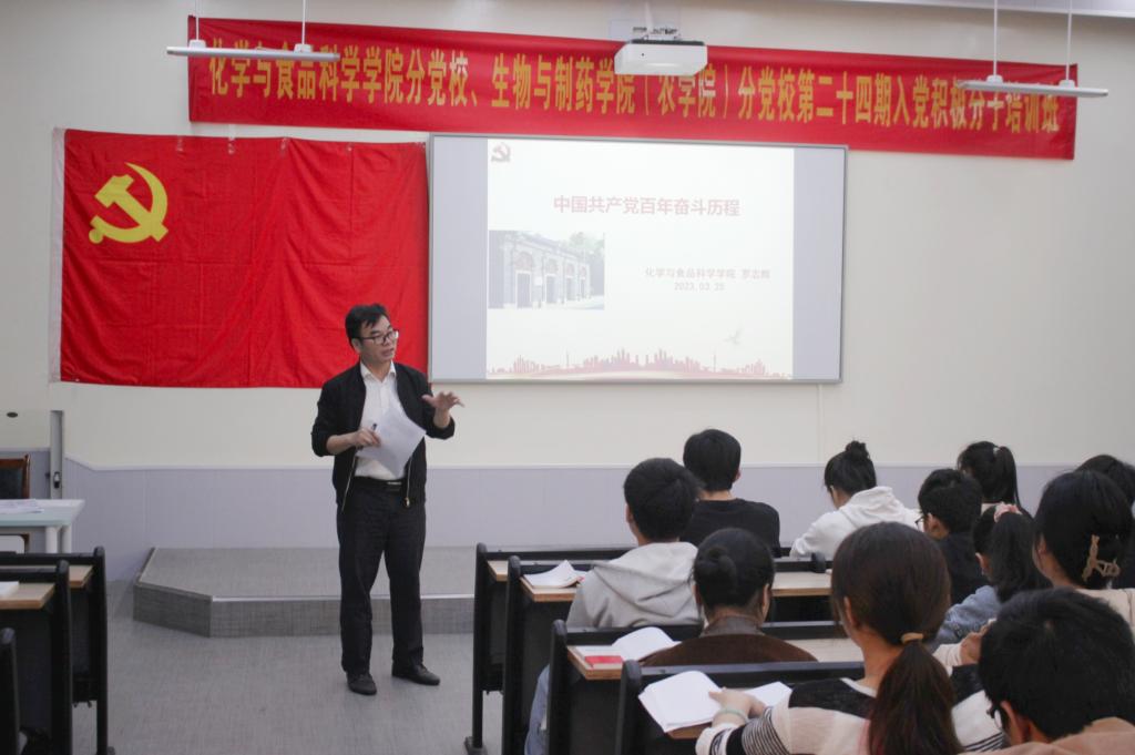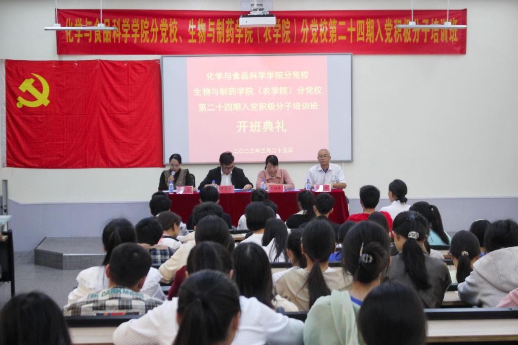 3月25日,伟德国际VICTOR1946联合化学与食品科学学院于我校东校区格物楼化学阶梯教室举行第二十四期入党积极分子培训班开班典礼。此次典礼由化学与食品科学学院党委副书记刘里琳主持,我院党委书记李桂芬、专职组织员赖兴珲以及化学与食品科学学院党委书记罗志辉、专职组织员邱勋宇出席开班典礼。