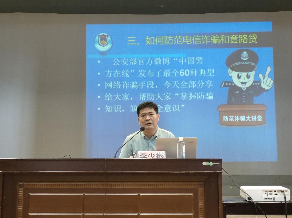 讲座上,李少彬从防抢防盗、预防电信诈骗和套路贷、网络安全等方面进行教育宣讲。他通过剖析发生在校园里典型案例,为同学们科普校园盗窃案的主要特点及原因。他还列举了各类偷盗、诈骗的应对方法和防范措施,提醒同学们要提高警惕,保护好个人财产安全。同时,他以一些有趣且有深度案例为引,告知同学们违反校规校纪的严重后果。针对网络安全等方面,他表示,同学们要深刻认识网络不良言论的严重危害,时刻谨记网络不是法外之地,在网络空间需理性表达、文明互动、依法上网、安全上网。