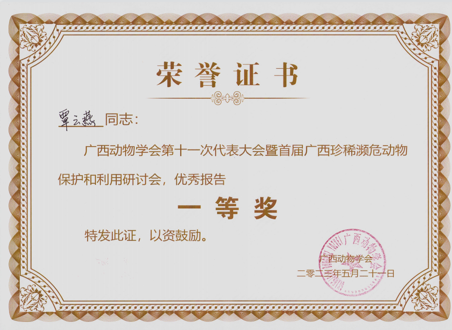5月21日,广西动物学会第十一次代表大会暨首届广西珍稀濒危动物保护和利用研讨会在梧州学院召开。我院副院长贝永建带领课题组成员参加了此次大会,2020级生物技术专业的覃云燕同学在优秀学术报告评比中获得一等奖。