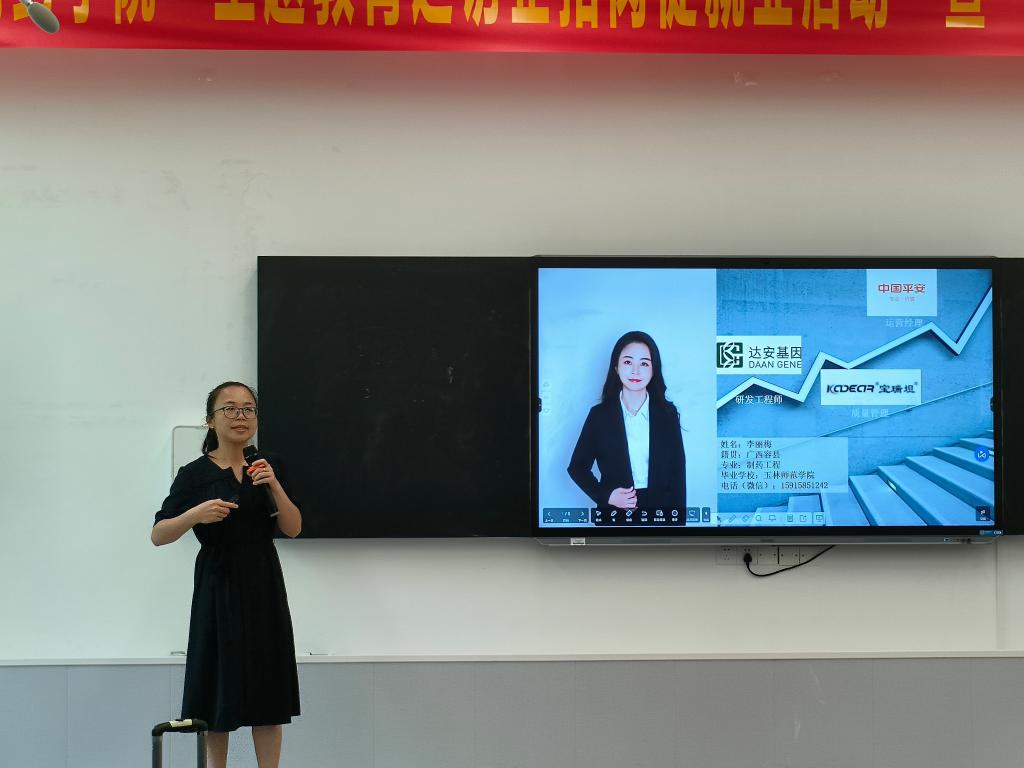 各位优秀校友回顾了在学校学习、生活的美好时光,讲述了自己励志勤学、刻苦钻研、自立自强的学习经历。随后,校友邹芸芸组织观看江苏恒瑞医药股份有限公司宣传视频,并从公司概况、研发体系、人才培养方案、岗位需求等方面进行了宣讲。校友李丽梅、吴海连依次向学生们分享各自工作经历、工作动力和职业感悟,鼓励感兴趣的同学们加入公司团队,共同努力奋斗。