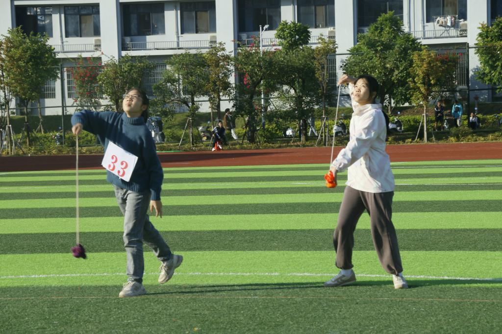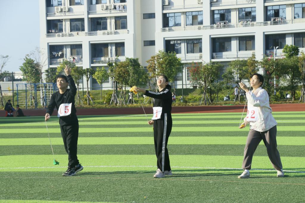 赛前,各组运动员们沉着冷静商讨安排战术,并积极进行热身训练,争取以自信饱满的精神状态参加比赛。随着裁判哨声令下,比赛正式开始,运动员们目光全神贯注盯着高杆铁环,用手捏着绣球尾线,运用向后挥动手臂,扭转手腕等技巧,将绣球抛掷高杆铁环内,绣球在空中划出一条条优美的抛物线。场外观众为运动员们加油助威声此起彼伏,络绎不绝,运动员们充分发扬团结合作、敢于拼搏的精神,其中我院运动员陈静投球动作行云流水且精准,绣球多次入筐,赢得了观众一片喝彩。