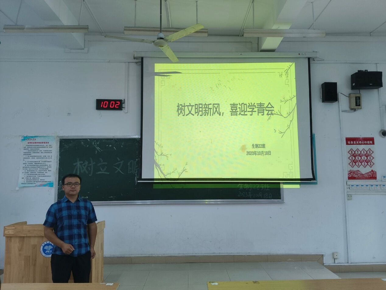 生科231班杨钊阐明了召开本次班会的目的,并从尊师致敬、勤学善思、言而有信、勤俭节俭等几个方面向同学们讲解文明的内涵。随后,他以“树文明新风,喜迎学青会”为主题组织同学们展开充分讨论;最后,该班班主任甘静梅及班助贺建国对会议进行总结发言,并教导学生们积极参与学校组织的活动。