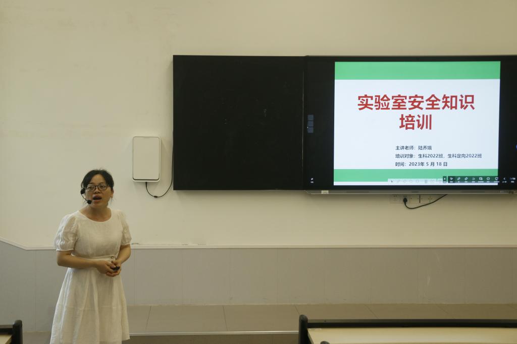 5月18日下午,我院生物科学专业于我校东校区格物楼物理阶梯教室召开实验室安全知识培训会。此次培训会由实验室管理教师陆乔娥讲授,我院22级生物科学专业全体学生参加。
